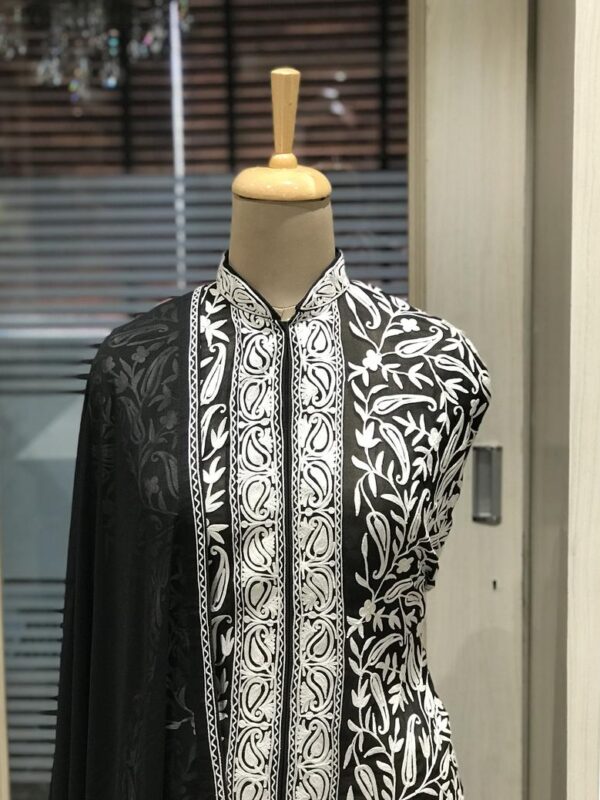 Intricate embroidery, a hallmark of Kashmiri craftsmanship, adorns the kurta. Delicate floral motifs dance across the neckline, sleeves, and hem. The design’s signature touch is a subtle floral pattern woven into the fabric to give a sense of comfort and luxury.