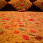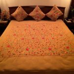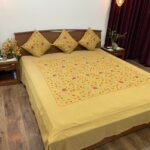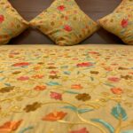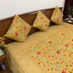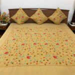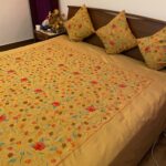 Beautiful Raw Silk Bed Cover with 4 cushion covers, featuring Kashmiri aari embroidery. This bed cover will give the ambience of your room a stylish touch.