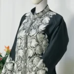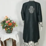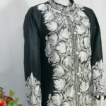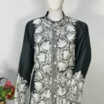 Jacket with chinar Kashmiri Puff Tilla embroidery all over. Tilla work adorns the Jacket and sleeve edges. A beautifully detailed jacket with a soft band neckline and a tailored silhouette for an ultra-flattering look. This Black Jacket with Silver Puff Embroidery comes with elegance for all your occasions.