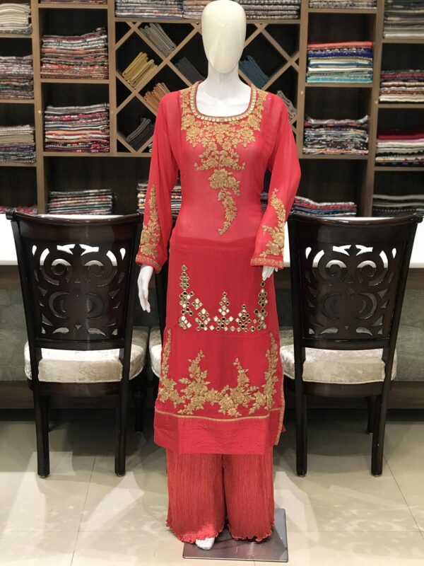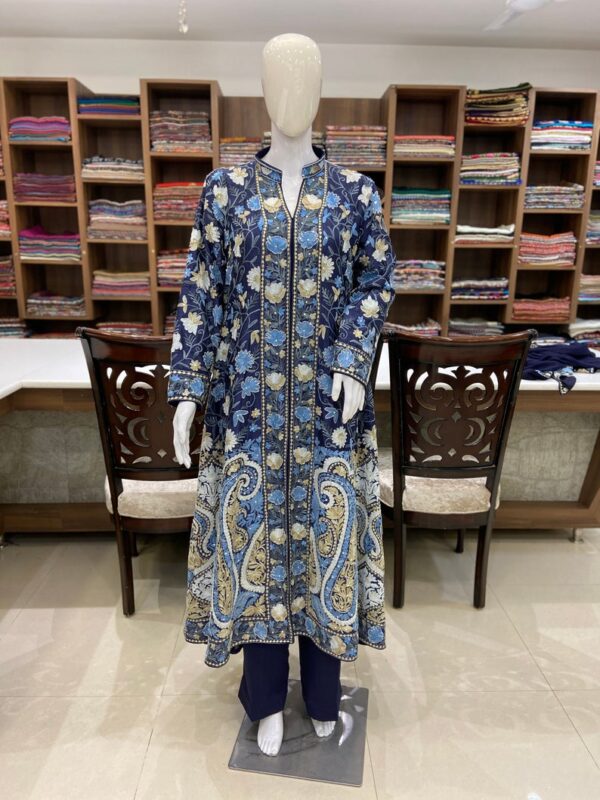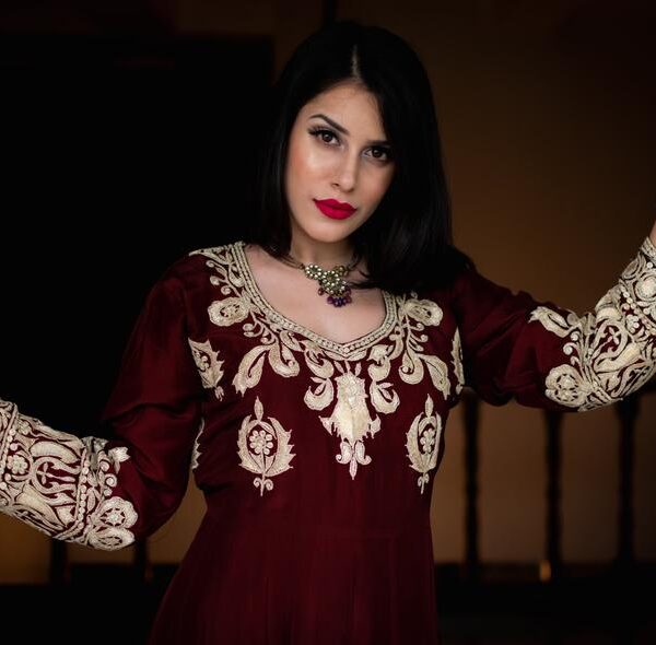 A floral pattern runs through this elegant kurti flaunting Aari threads and Tilla work. The star of the show lies in the breathtaking floral embroidery that adorns the kurti. Inspired by the stunning blooms of Kashmir, delicate and blossoming vines are meticulously hand-stitched in shades of rose, fuchsia, and a touch of wild flowers.