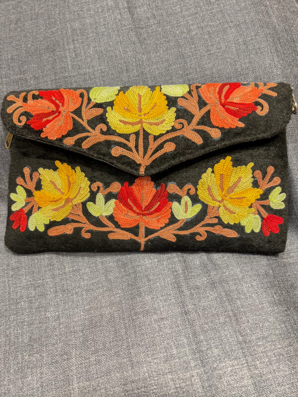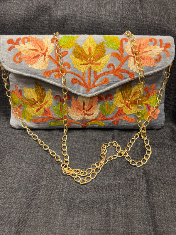 Introducing our stunning Grey Velvet Aari Embroidered Kashmiri Clutch Bag, the perfect accessory to elevate any outfit. Crafted with precision and care, this bag is a testament to the rich cultural heritage of Kashmir.