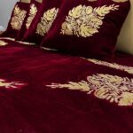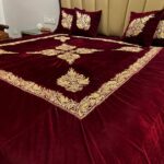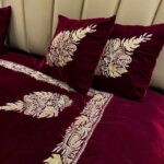 Beautiful Velvet Bed Cover with 4 cushion covers, featuring kashmiri tilla embroidery. This bed cover will add a royal ambience to your bedroom.